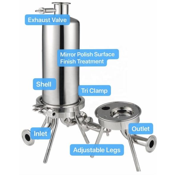 The housing is typically made of durable materials such as stainless steel or polypropylene to withstand the operating conditions and pressures involved. It consists of a chamber or vessel with inlet and outlet ports for the fluid to pass through. Inside the housing, there are multiple cartridge slots or tubes where the filter cartridges are inserted